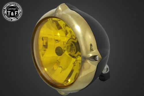 - 5.75インチビンテージヘッドライト(真鍮リム/マットブラックボディ)ユーロレンズ仕様(イエロー) -
