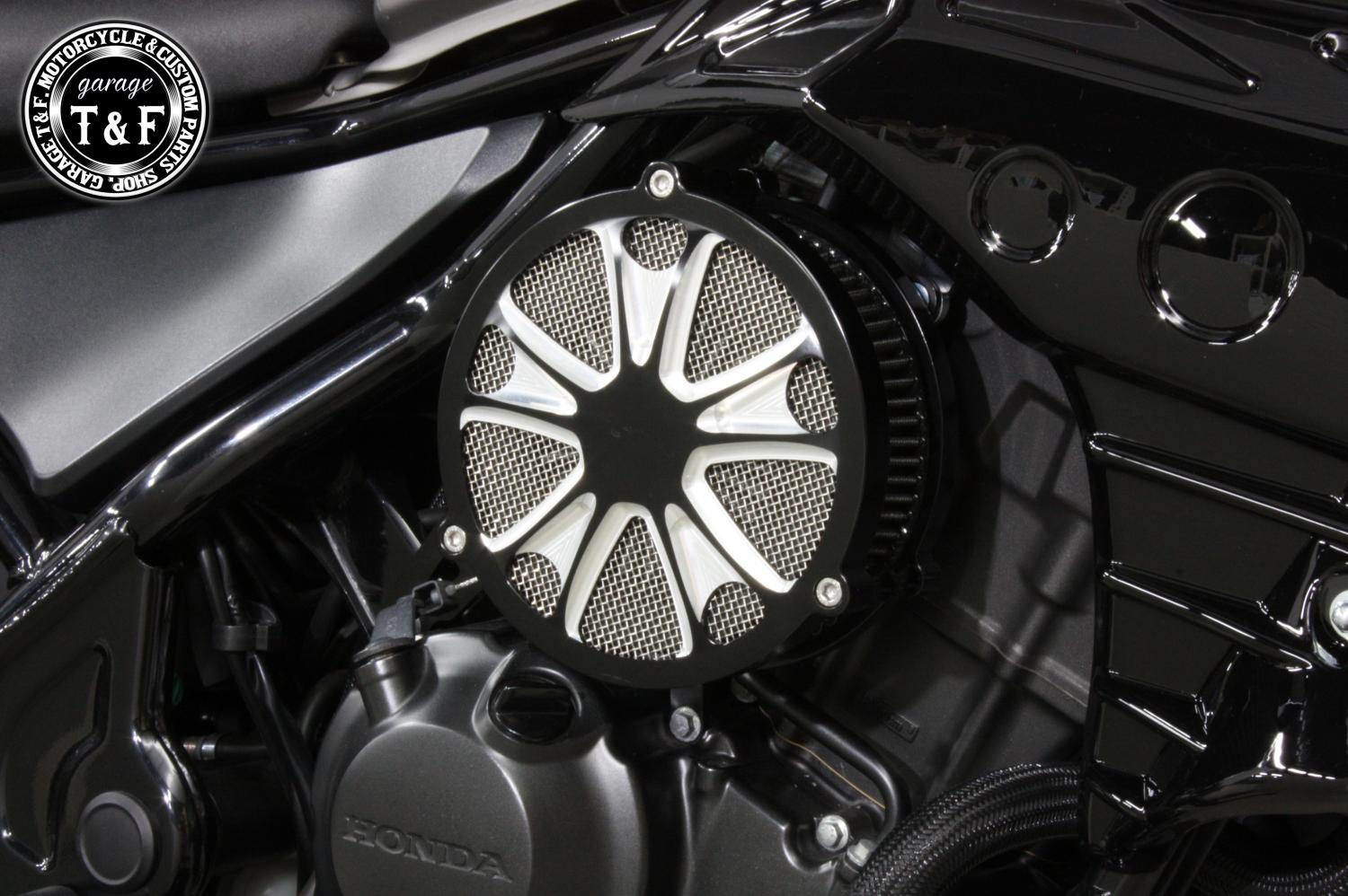 ・本来、レブル250のエンジン横にはエアクリーナーは装着されていませんが、このダミーエアクリーナーを取り付けることで、サイドビューが一気に迫力あるカスタムスタイルに変身します。