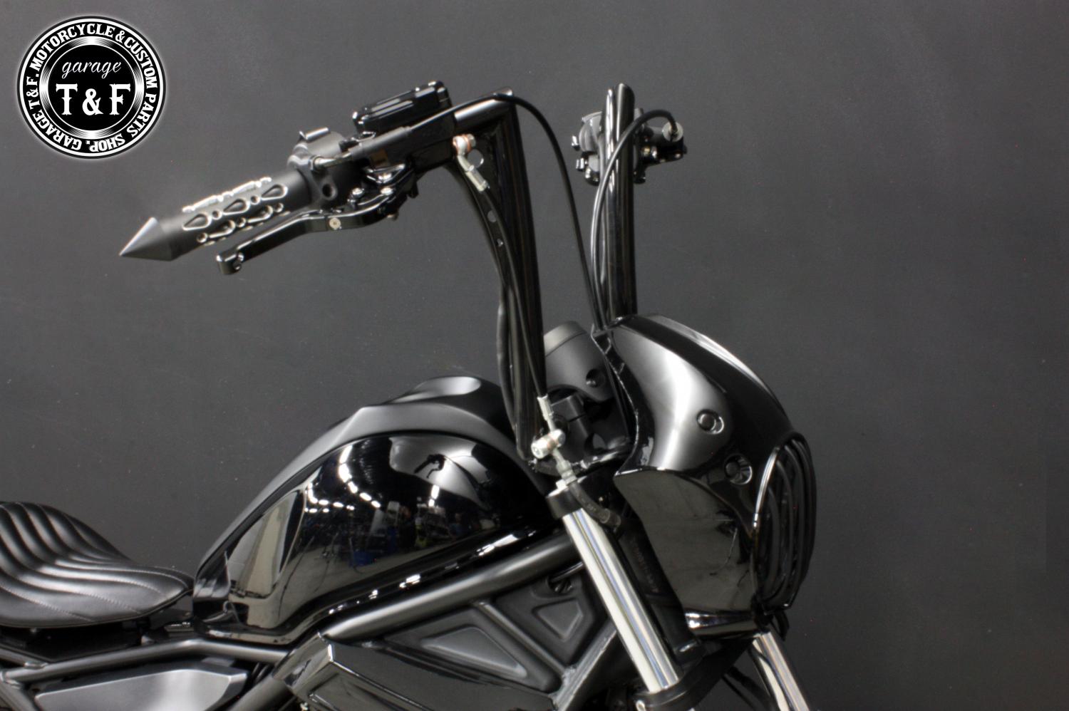 ・ハンドルの太くなっている箇所はクランプパーツ(ハンドルクランプ式ミラーやクランプ式メーターなど)が適合しない場合がございます。