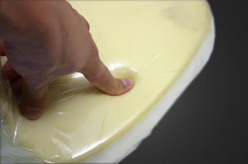 ・シートインナー(発泡ウレタンフォーム)は防水用の収縮する透明フィルムで覆われています。この特殊なフィルムは押したり、引っ張ったりしても簡単に破れるようなことはありません。