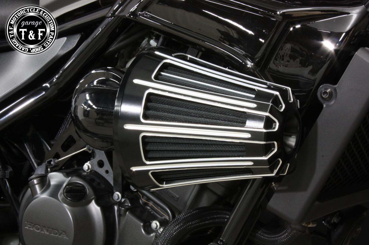 ・本来、レブル250のエンジン横にはエアクリーナーは装着されていませんが、このダミーエアクリーナーを取り付けることで、サイドビューが一気に迫力あるカスタムスタイルに変身します。