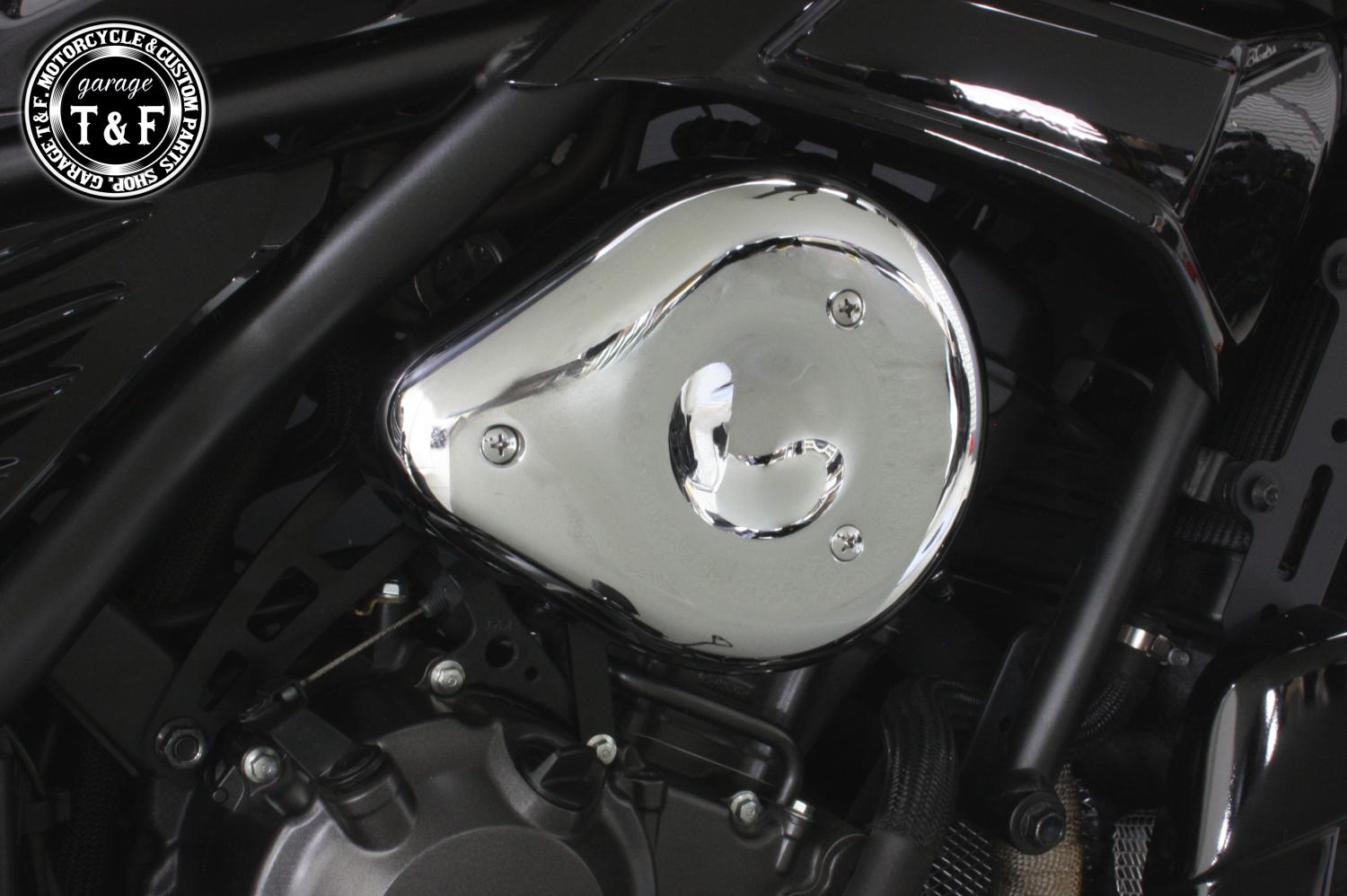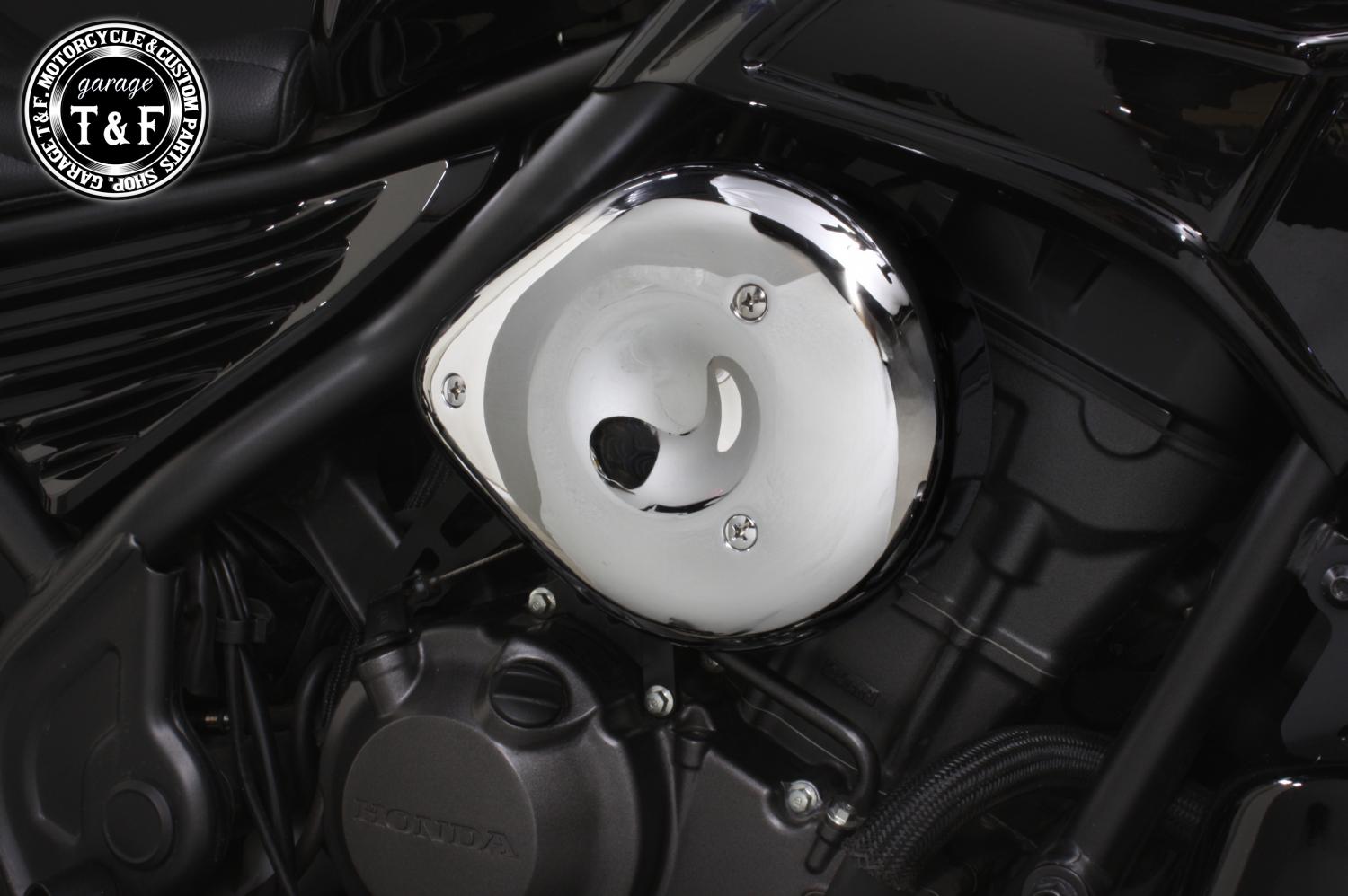 ・本来、レブル250のエンジン横にはエアクリーナーは装着されていませんが、このダミーエアクリーナーを取り付けることで、サイドビューが一気に迫力あるカスタムスタイルに変身します。