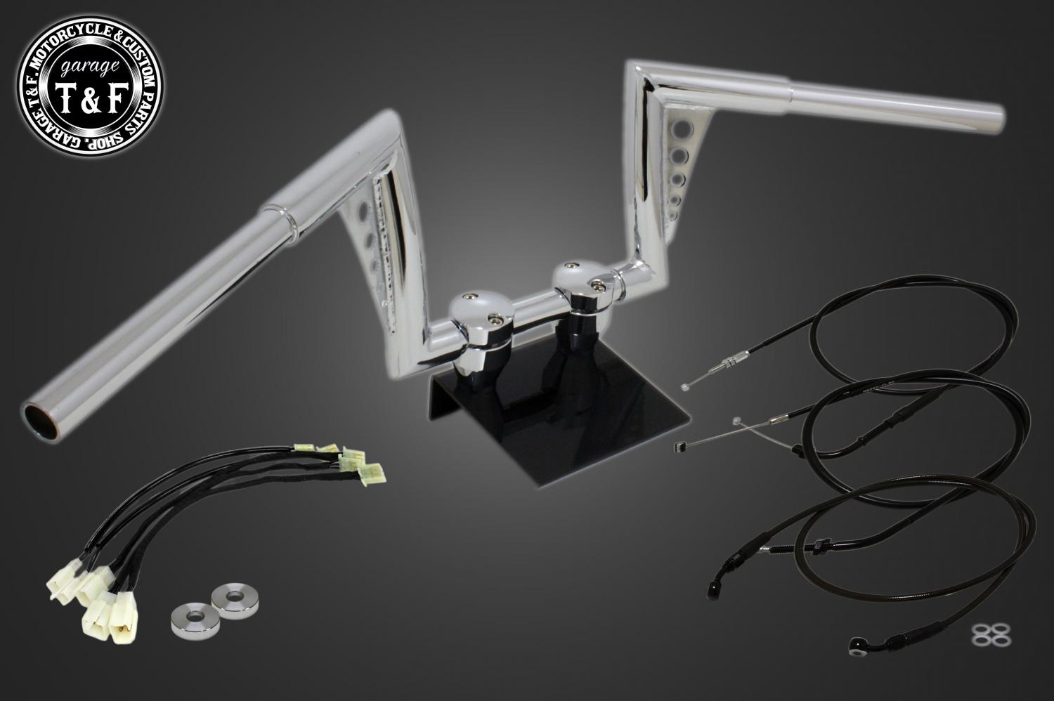 ハンドルと、適正サイズのアクセルワイヤー、クラッチワイヤー、ブレーキホース、延長ワイヤーハーネスをまとめてご用意しました。追加購入や長さ選びの心配がなく安心してハンドル交換をお楽しみいただけます。