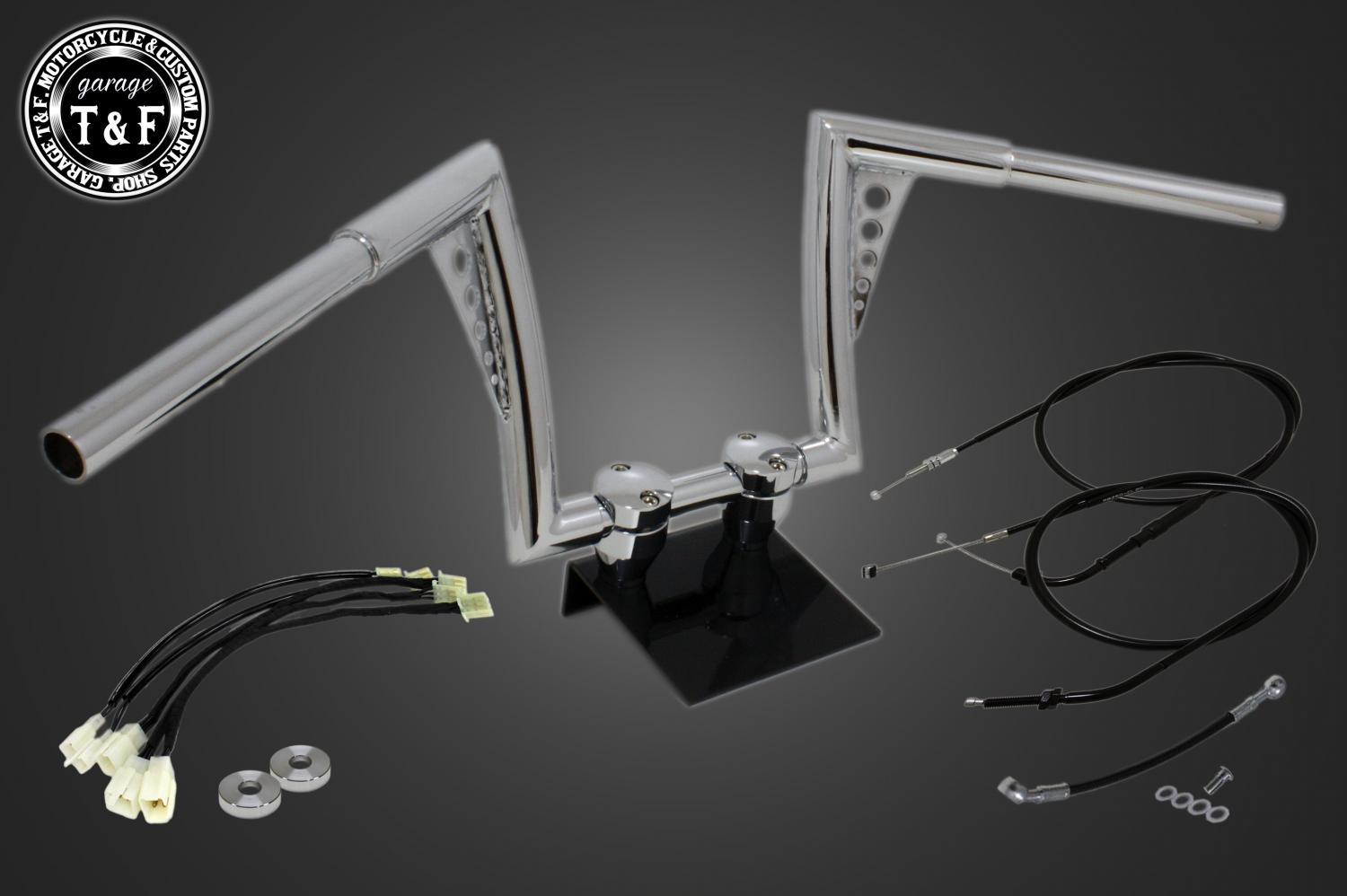 ハンドルと、適正サイズのアクセルワイヤー、クラッチワイヤー、ブレーキホース、延長ワイヤーハーネスをまとめてご用意しました。追加購入や長さ選びの心配がなく安心してハンドル交換をお楽しみいただけます。